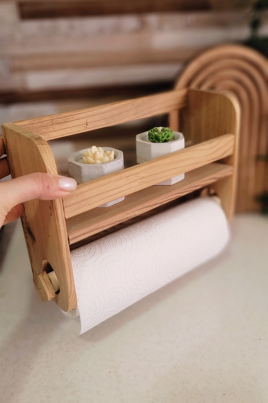 🔷️🩷استند چوبی این قابلیت را دارد که علاوه بر نگهداری دستمال ،انواع دکوری مینیمال را میتواند دکور کند. کافیه استند را ، به دیوار مورد نظر وصل کنید و روی آن را با شمع دکوری زیبا،گلدان کوچک و ... تزیین کنید .جنس چوب روس و قابل شستشو بودن از دیگر مزایای این استند است.